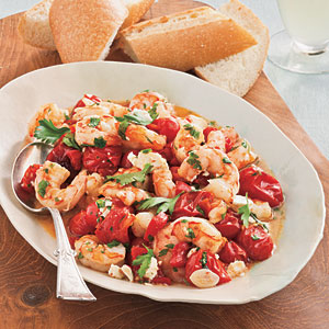Add butter, pepper, and salt to tomato mixture, stirring until butter melts. Return shrimp to pan; cook 2 minutes or until thoroughly heated. Sprinkle with cheese before serving.