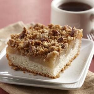 Prepare bread mix according to package directions. Spread dough into a greased 13 x 9-inch pan and let rise 25 minutes. Top with apple pie filling. Mix together brown sugar, oats, flour, pecans, cinnamon and butter. Sprinkle over pie filling.