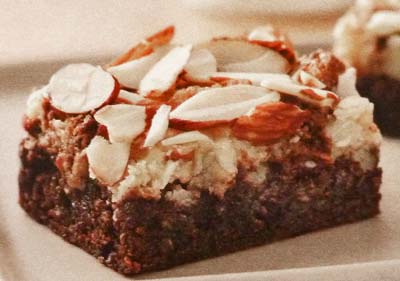 6.Sprinkle candy bar pieces and sliced almonds over top of brownies.