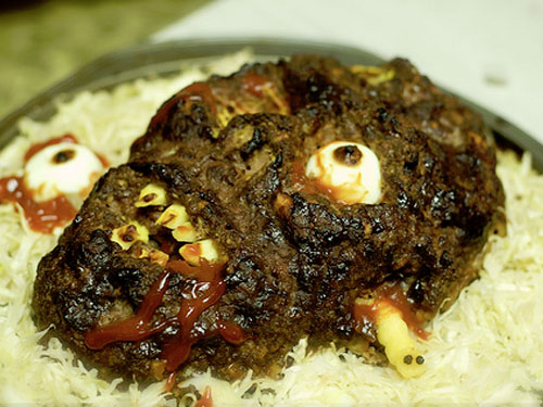 7. Remove from oven and pop one "eyeball" out and use the ketchup mixture as "blood."
