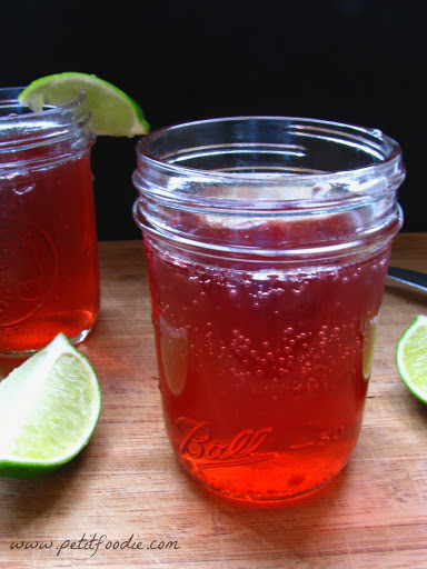 Mix the first three ingredients into a mason jar and shake. Fill a glass halfway with ice and soda. Pour the mason jar mixture over the soda and ice glass.