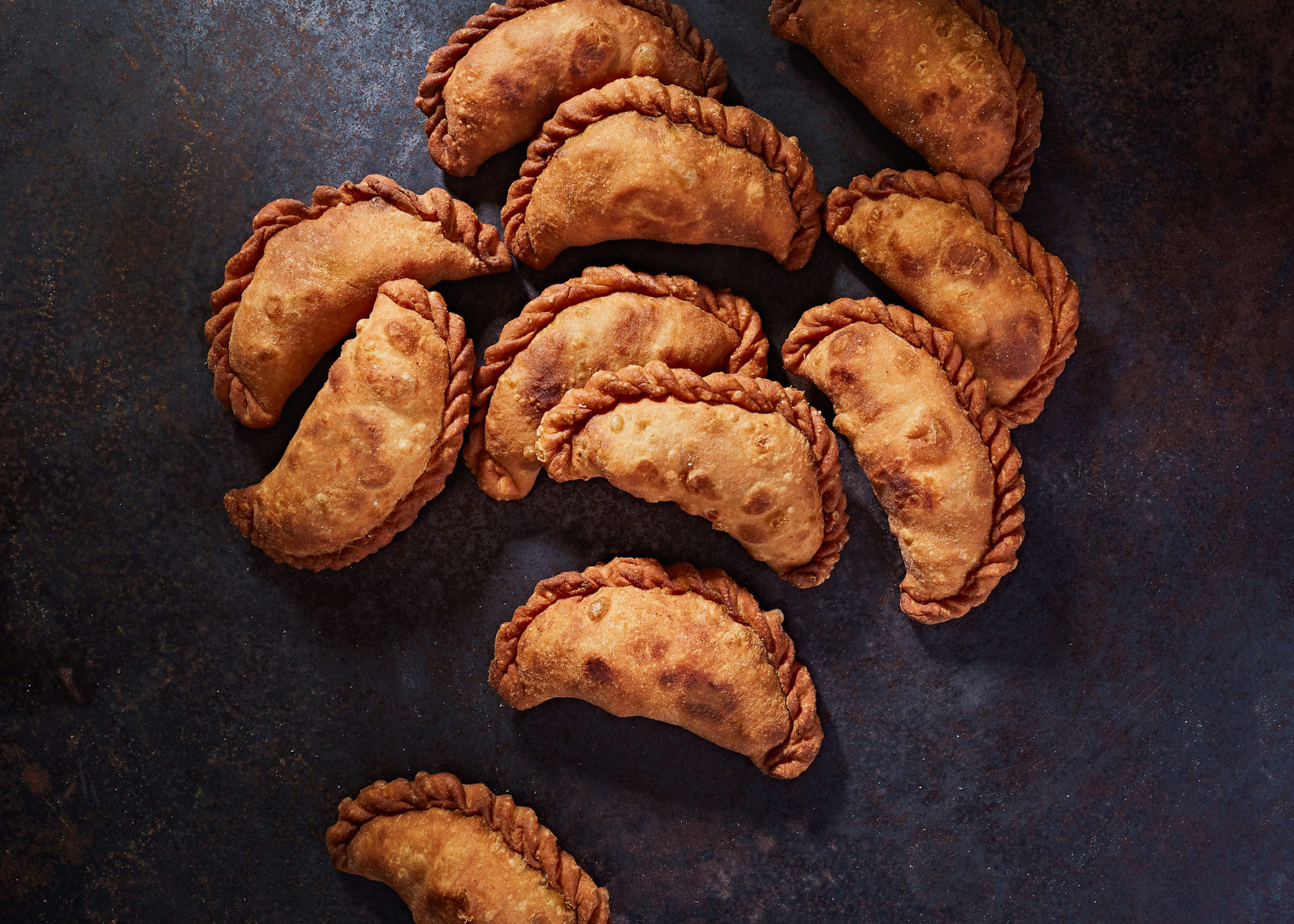 Place about 1½ to 2 tablespoons of filling into the center of the flattened dough. Fold the dough over the filling into a semicircle and seal it by pinching, folding, and crimping the edges. Alternatively, for a quicker and easier method, you can seal and crimp them by pressing the edges with a fork. Repeat with the remaining pieces of dough.