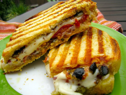 Set panini press to medium high. Spread a thin layer of tapenade on one slice of bread, top that with two thick slices of mozzarella and sliced roma.