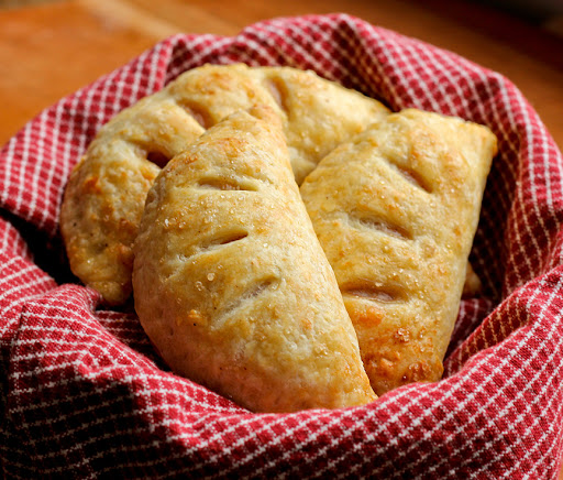 Add around 1–2 tablespoons of filling to each circle of dough and dot with butter. Rub a little bit of water around the edges, then fold over and press with a fork to seal. Repeat with the second batch of dough, and arrange pies on a parchment-lined baking sheet. Refrigerate for half an hour.