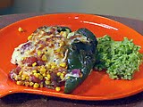 Split the charred peppers open but not in half with small sharp knife then scoop out the seeds with a small spoon. Place peppers in a shallow baking dish and stuff each split pepper with lots of the corn mix, top each pepper with 1/4 cup cheese and place back under broiler to melt and char the cheese.