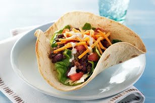 FILL tortilla shells with salad greens, meat mixture, cheese and tomatoes. Drizzle with dressing.