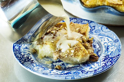 Pour liquid over the bread and bake for 55 to 70 minutes, or until crust is golden brown all over the top.