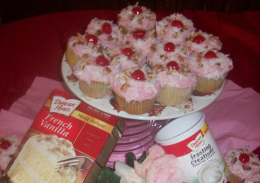 7. Frost top of each cupcake with blended frosting evenly. Sprinkle over top of each frosted cupcake with coconut and remaining 1/3 cup chopped pecans evenly. Place a cherry half onto the top center of each decorated cupcake, with reserved cherry halved to complete. Serves 24 cupcakes.