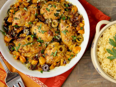 Reduce heat to medium. Add onion and sauté until soft and golden, 5 to 6 minutes. Add garlic and ginger and continue cooking, stirring constantly, for 3 minutes. Add cinnamon, turmeric, chili pepper flakes, salt, and pepper; stir to combine. Return chicken to pot and add apricots, prunes, olives, chicken broth, and ¼ C. parsley. Bring mixture to a boil, remove pot and cover; place in 350 degree oven for approximately 30 minutes. Remove from oven, place chicken on platter and top with remaining parsley and lemon zest.