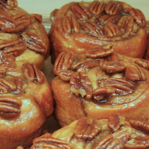 10. Dip the top of each roll in the melted butter, then in the sugar and pecan mixture, being sure to secure a few pecans onto the bottom each roll.
