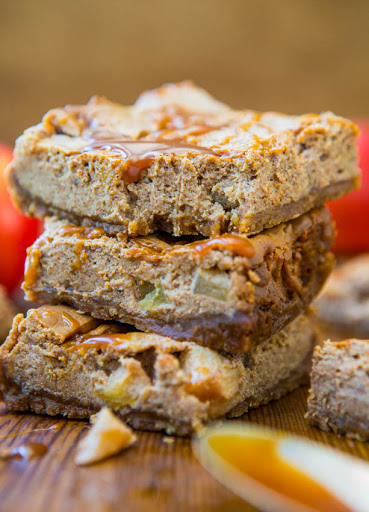 Before slicing, drizzle about 1/4 cup caramel sauce over top; or add extra caramel to each piece individually prior to serving. Bars will keep airtight in the refrigerator for up to 1 week.