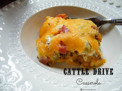Are you looking for an easy family dinner night recipe? Try a cattle drive recipe that's made with ground beef, onion, pepper, sour cream, mayonnaise, cheese, chillies and bisquick.