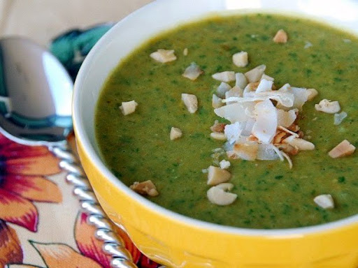 Let soup cool before pureeing. Pour half of the lentil mixture into a blender and puree. Pour pureed lentil mixture into a bowl, and repeat process with the remaining soup. Once the soup is blended, return to the pan. Add coconut milk, spices, ginger and salt. Stir well. Cover and simmer for 10 minutes or until thoroughly heated through. Remove from heat, and season to taste with salt. Ladle soup into bowls and garnish with toasted coconut and peanuts.