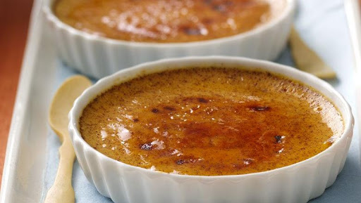 Sprinkle 1 teaspoon sugar over each chilled custard. Holding kitchen torch 3 to 4 inches from custard, caramelize sugar on each custard by heating with torch about 2 minutes, moving flame continuously over sugar in circular motion, until sugar is melted and light golden brown. (To caramelize sugar in the broiler, see Broiler Method below.) Serve immediately, or refrigerate up to 8 hours before serving.