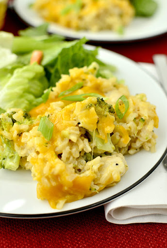 Preheat broiler. Combine cooked rice and broccoli mixture with cheese sauce then scoop mixture into a nonstick sprayed 9×13 baking dish and top with remaining cheese. Broil until cheese is melted then let casserole rest for 5 minutes before serving.