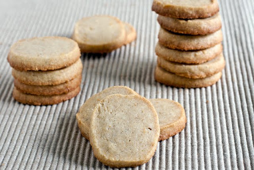 3. Preheat an oven to 350 and line a baking sheet with parchment/silpat. Remove the plastic wrap. Using a sharp knife and cut each unwrapped log into 1/4 inch slices. Place the cookies an inch apart on the baking sheet.
