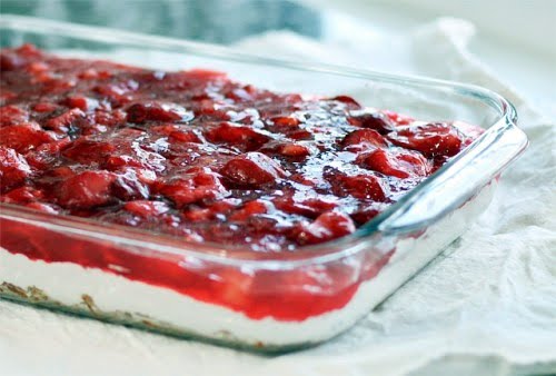 Strawberry pretzel salad recipes are nearly identical, but Paula Deen’s is my favorite, because she’s added something inspired to the strawberry topping: a small can of crushed pineapple. That little bit of tang livens up the fruit layer and keeps the salad from being too sweet.