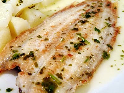En la sartén donde los hemos frito, la limpiamos con papel de cocina y a continuación ponemos la mantequilla, el zumo de limón y perejil fresco. Lo calentamos y lo tiramos sobre los lenguados que acompañaremos con unas patatas hervidas al vapor
