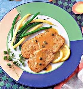 - 4 veal scallops, about 3/4 pound, pounded to a thickness of 1/8-inch