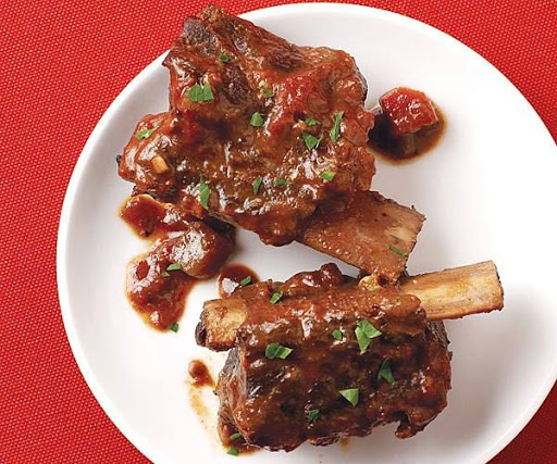 Transfer all the ribs (and any juices that have accumulated) back into the pot. Pour 1-1/2 cups water, the tomatoes, beef broth, and remaining 1/2 cup red wine over the ribs and using tongs, arrange the ribs as evenly as possible and no more than two layers deep.