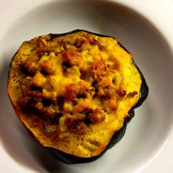 Meanwhile, cook beef and pork in 1 tablespoon of oil on medium high heat until well browned, stirring frequently to crumble. Drain, and set aside. In the same skillet, cook the onion and garlic until onion is translucent. Combine beef and pork with cheese and onions, and spoon mixture into squash halves.