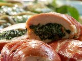 Cut into and across but not all the way through the chicken breasts, opening them up like a book with a sharp knife. Season the chicken with salt and pepper. Fill each with a small mound of stuffing. Flap chicken breasts back over stuffing and wrap each breast with prosciutto to seal them, carefully covering the whole breast. Brush chicken all over with some extra-virgin olive oil and roast 18 to 20 minutes until cooked through.