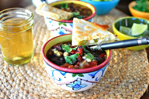 Black Bean and Corn Soup + Spicy Mexican Three Cheese Quesadillas