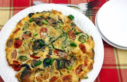 While the veggies are cooking, mix 4 eggs in mixing bowl with 1/2 cup of milk and the cheese. Slowly pour over the veggies in pan. Let cook over medium heat for 2 minutes. Sprinkle with salt and pepper and green onions over top. Transfer to oven for exactly 10 minutes.