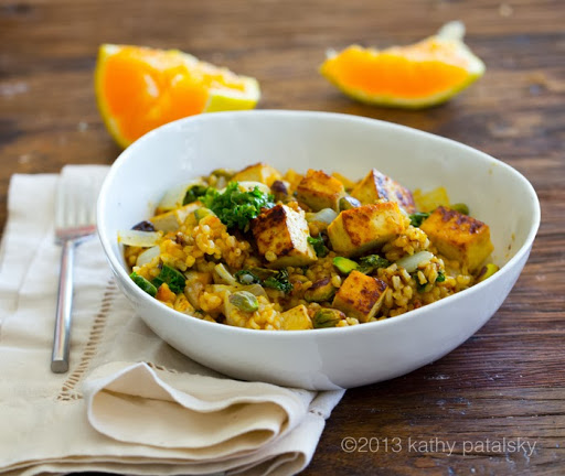 3. Add in the fresh orange juice from the orange to hydrate the pan and ingredients. Saute until the liquid absorbs. The scoop all the rice to one side of the pan in a thick mound. In the empty space in the pan add a 1/2 tsp of oil (if the pan is bone dry) and the tofu cubes. Drizzle the maple syrup over the tofu cubes and add a pinch of salt and pepper to the cubes too. Saute, still on high heat until the edges blacken. Add the diced orange and toss all the tofu cubes with the rice in one final minute of saute.