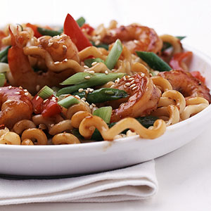 Stir-fried shrimp and vegetables and an Asian sauce make for a fun and quick pasta dinner.