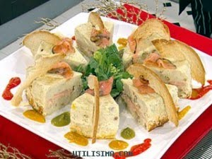 Una vez hecho todo esto, en un molde desmontable vertemos la mitad de la preparación del lenguado, luego una cápa de láminas de salmón rosado, y encima el resto de la crema de lenguado.