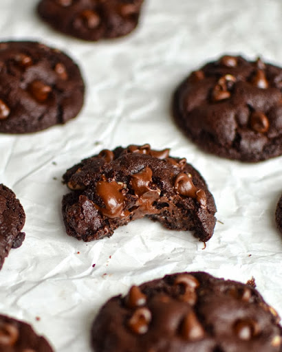 Preheat oven to 350ºF. Mix together the butter and sugars. Add the egg and vanilla and mix until combined. Mix together the soda, salt, and cocoa and add to the wet ingredients, mixing until combined. Stir in the chocolate chips and nuts. Bake for about 10 minutes or until they look done.