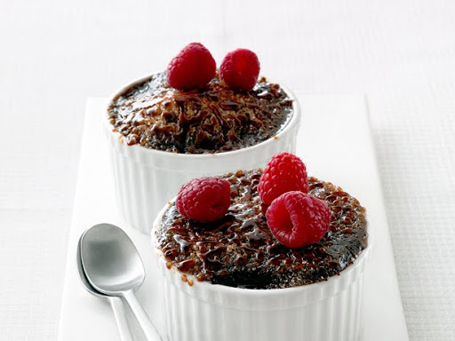 • Spoon prepared chocolate pudding into ramekins. Sprinkle each with 1 heaping tablespoon turbinado or raw sugar. Caramelize the sugar with a kitchen torch. Top with raspberries.