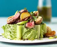 4. Place slice of romaine on each serving plate; drizzle; with 1/2 of the Salsa Verde. Toss warm potatoes with remaining sauce and green onions. Spoon onto romaine. Thinly slice steak and place on top of potatoes. Makes 6 servings.