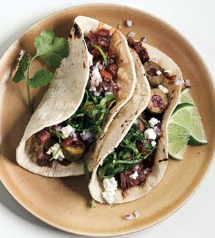 •Char tortillas over gas flame or in broiler until blackened in spots, 15 to 20 seconds per side. Divide filling among tortillas. Sprinkle with cilantro and serve.