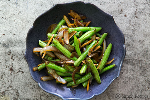 Add the cut green beans, sliced onions and julienned ginger and toss to combine. Break up any clumps of sliced onion that might have stuck together. Spread everything out in the pan and let it sear untouched for anywhere from 30-90 seconds, you want to get a little browning on the vegetables. Stir the vegetables and let sit for another 30-90 seconds. Add the sliced garlic, stir again and cook for another minute.