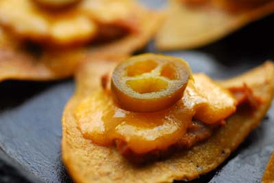 5. Once chips have been made, spread each with 1 teaspoon of refried beans (if you so desire), 1 tablespoon of cheddar cheese and 1 pickled jalapeno.