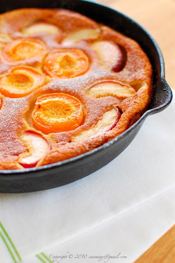 Pour batter over peaches and bake for 40-45 min or until golden brown. Serve warm or at room temp. Sprinkle with powdered sugar