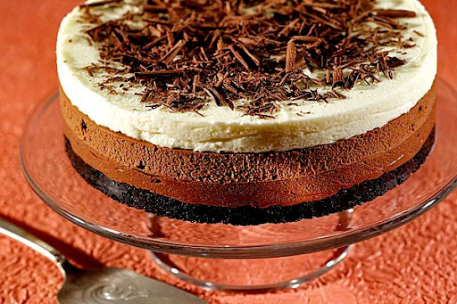 - Prepared chocolate cookie crust with set bittersweet and milk chocolate mousse layers