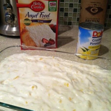 Mix the contents of the angel food cake mix ( do not follow the box directions or add anything) with the can of crushed pineapple & the juice.