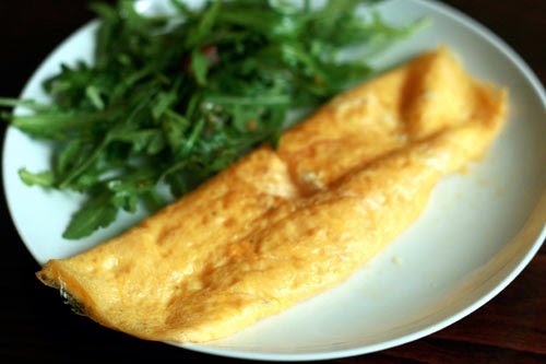 Using a spatula, fold one side of the omelet 1/3 of the way towards the opposite side. Tip the omelet out of the pan, rolling it onto a plate so both sides fold under. Serve immediately.