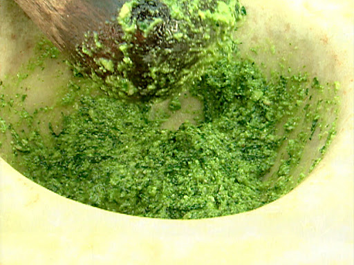 Using a pestle and mortar, combine the basil and the parsley and crush until a paste starts to form. Add the rest of the ingredients and continue to crush until a creamy paste has formed.