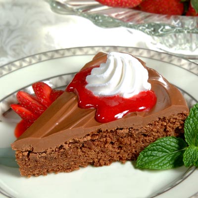 PLACE strawberries and sugar in blender; cover. Blend until smooth. Refrigerate until serving time. To serve, cut into wedges. Garnish with strawberry sauce, whipped cream, strawberries and mint leaves.