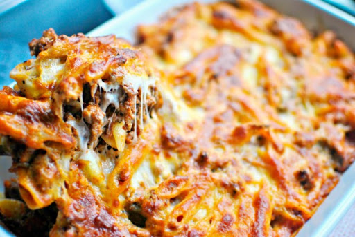 In an 8x11 baking dish; layer half of the meat/sauce mixture. Top with half of the shredded Mozzarella and then repeat with the remaining sauce.