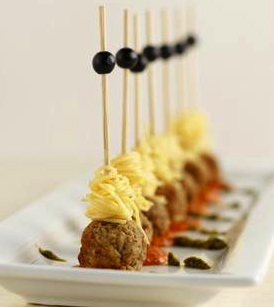 - 2 pounds packaged cooked meatballs (1/2 ounce each), heated according to package directions