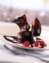 To serve, using a fish slice, transfer the coated chocolate mousses on to serving plates and leave to defrost at room temperature for 10 minutes, then decorate with the strawberries and raspberries and drizzle around the cooled chocolate ganache. Now, working quickly, remove the sheet of chocolate shards from the freezer and peel away the cling film, then break into shards and stick two into the top of each Dunbrody Kiss.