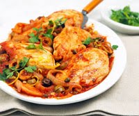 2. Stir tomatoes, olives, capers, lemon peel, and oregano into onion mixture. Place chicken on tomato mixture. Bring to boiling; reduce heat. Simmer, covered, for 13 to 15 minutes or until chicken is no longer pink (170 degrees F).