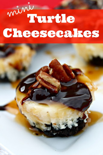 Completely combine Oreos and butter, and press mixture in the bottom of each liner. Mix together cream cheese, eggs, sugar, vanilla, and lemon juice until light and fluffy. Spoon the cream cheese mixture into each liner, filling it almost to the top. Bake for 15 minutes at 350 degrees. Let cool completely, and then refrigerate for at least an hour. Top each with pecan halves, and drizzle with fudge and caramel.