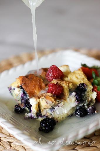In a large bowel combine eggs, syrup, and milk; whisk to blend. Pour evenly over bread mixture.