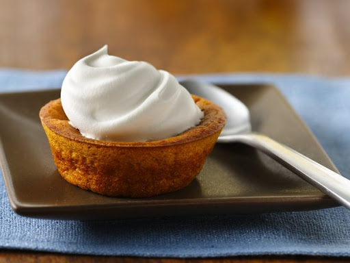Bake about 30 minutes or until muffin tops are golden brown and edges are starting to pull away from sides of pan. Cool 10 minutes. With thin knife, loosen sides of pies from pan; remove from pan and place top sides up on cooling rack. Cool 10 minutes longer, and serve with 1 generous tablespoonful whipped topping.